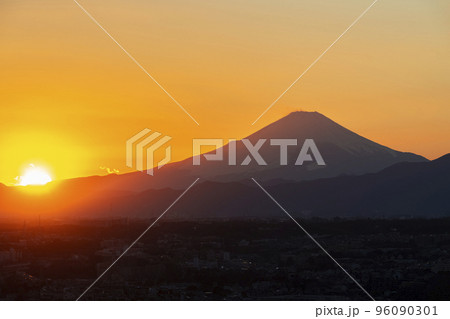夕日に照らされオレンジ色に染まる世界文化遺産 富士山のシルエット