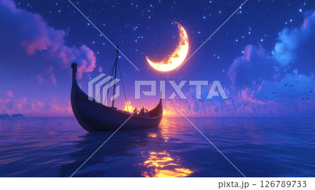 Jesus walks on water at sunset near a fishing boat with followers in the background, capturing a moment of tranquility and faith