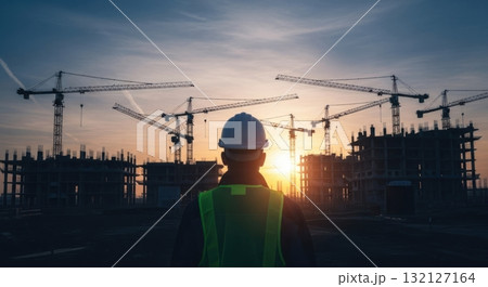 Construction worker in hard hat overlooking a large building site with cranes at sunset