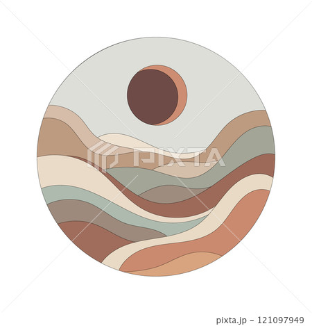 Vibrant sunset over mountain horizon with colorful stripes and abstract wave patterns