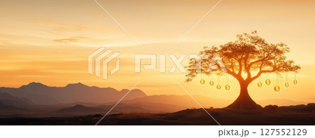 Baobab Tree Silhouette with Financial Symbols Hanging at Sunset in Desert Landscape