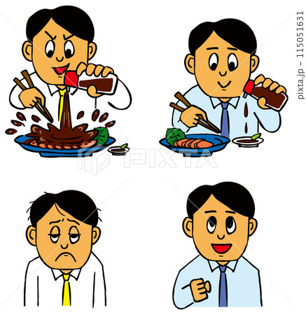 しょうゆをかけすぎて健康を害した人と適量で健康な人4点セット