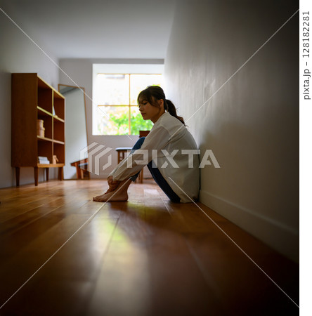 沈んだ表情で、部屋の隅にうずくまって座る少女