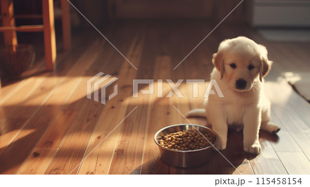 ドライフードに不満そうな表情をうかべるゴールデンレトリバーの子犬