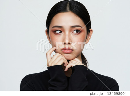 シンプルな背景で考え込む表情の女性ポートレート(AI生成画像)
