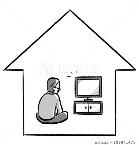 家に引きこもりテレビを見るおじいちゃんの手書き風モノクロイラスト