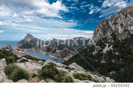 Panoramic view over the sea, cliffs, rocks and mountains of Cap de Fromentor, Mallorca, Spain