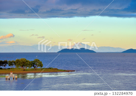 夕暮れの琵琶湖畔:近江八幡市の湖岸から眺めた沖島