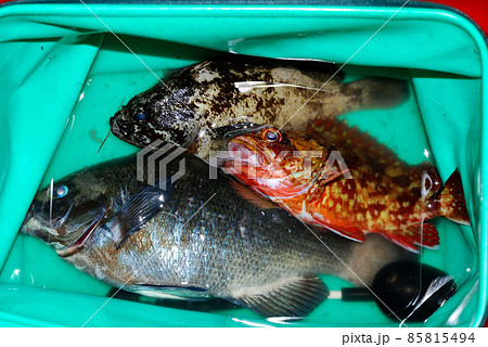 釣ったメジナとカサゴ、ソイをバッカンに入れた