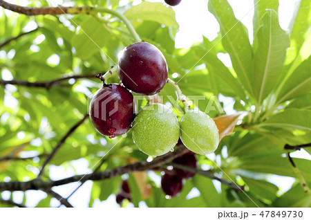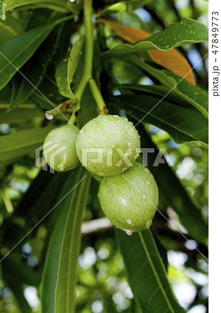 自然 植物 キバナキョウチクトウ、黄色い花と変わった形の果実。六月の石垣島、民家の庭先で