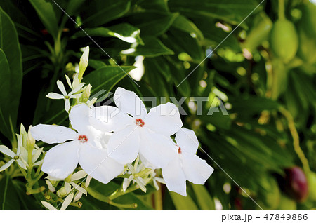 自然 植物 ミフクラギ、『オキナワキョウチクトウ』。中心に薄紅をさした美しい花。夏の間中楽しめます