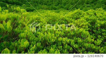 Green mangrove forest. Mangrove tree with root. Natural carbon sink fight climate change. Sustainability in carbon-neutral ecosystems. Green and sustainable environment. Natural carbon capture.