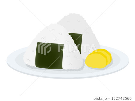 皿に乗った三角形のおにぎりと沢庵のイメージイラスト