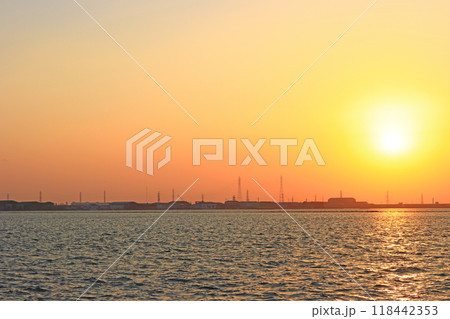 愛知県名古屋市、藤前干潟に沈む夕日の風景