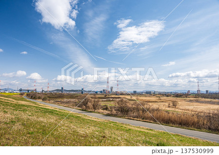 淀川右岸の冬枯れの河川敷風景 大阪府高槻市