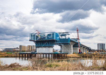 淀川に架かる工事中の新名神高速道路 大阪府高槻市 枚方市