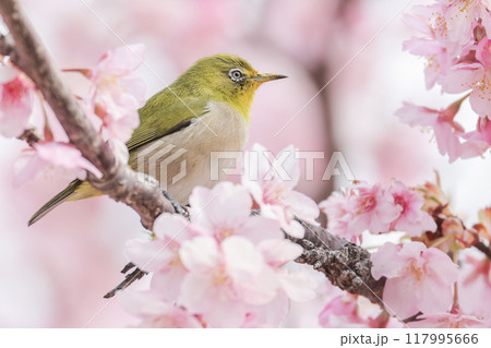 河津桜の枝に止まるかわいいメジロ 複数 春
