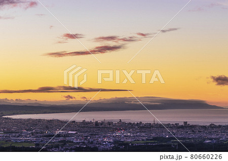 青森 夕景茜色に染まる青森市中心街遠景 横05