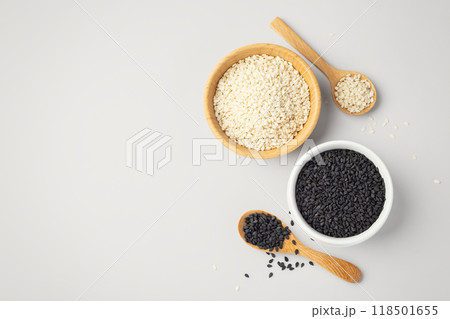 Black and white sesame seeds in wooden bowl with spoon on beige background