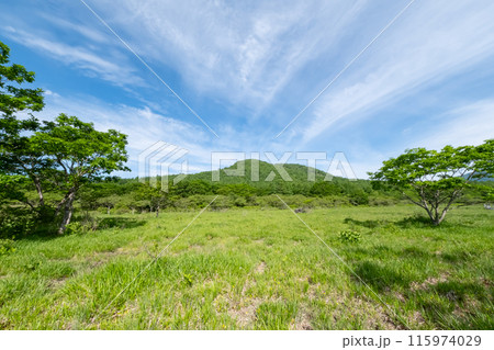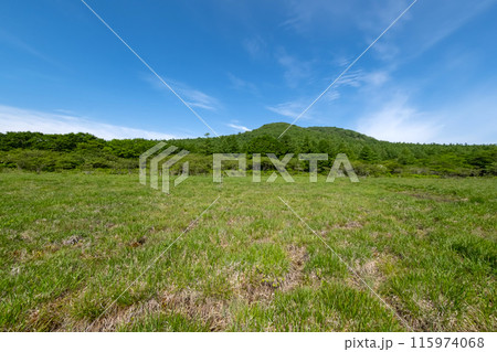 栃木県那須塩原市沼ッ原湿原の爽やかな青空と草原