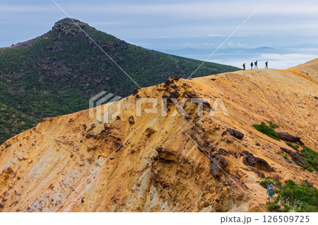 安達太良山・沼ノ平火口壁稜線の登山者