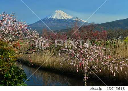富士山と小川に咲く桜