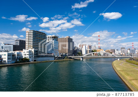 静岡県沼津市 狩野川と市街地の街並み 永代橋から
