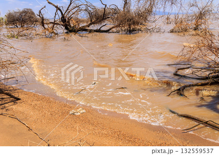 Close-up of sea shore with wave, sand, and washed seaweed