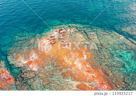 Seascape background. Drone view. Rocky seashore. Nature rocky background