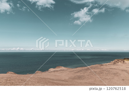 Sand dunes and seascape next to Rubjerg Knude Lighthouse.