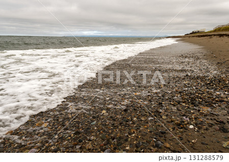 Ocean waves washing over pebble-strewn sandy shoreline