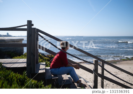 Middle-aged woman sitting on a wall looking at the ocean in Portugal, enjoying a sunny summer day