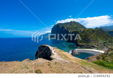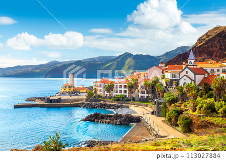 View of the small village of Canical and Marina da Quinta Grande, near Ponta de Sao Lourenco. Madeira Island, Portugal