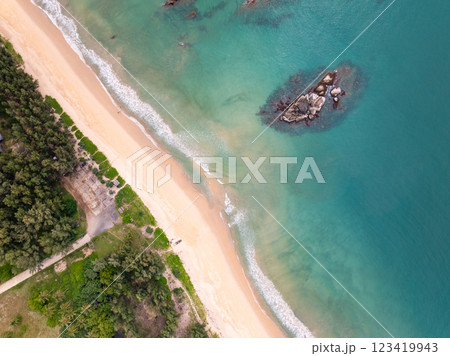 Aerial view sandy beach and waves Beautiful tropical sea in the morning summer season image by Aerial view drone shot, high angle view Top down beach sand