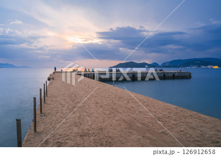 Pier in the sea at sunrise in the morning. View of Vinpearl Island in Nha Trang in Vietnam