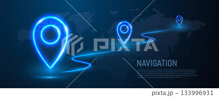 A banner with neon GPS coordinates. Neon map pins on a dark blue background.