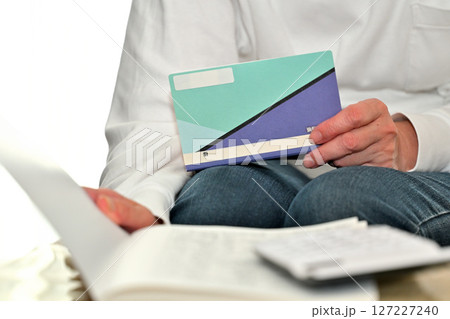 預金通帳 貯金通帳を確認するシニア