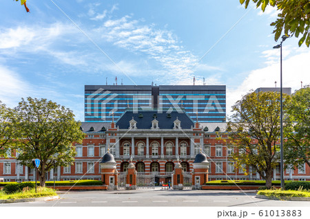 法務省旧本館赤れんが棟外観と特徴ある門 青空が背景