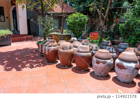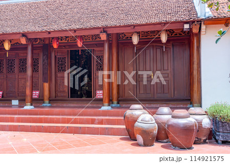 ベトナムハノイ 国家文化財に指定されたドンラム村のお寺 ミア寺の中庭と壺