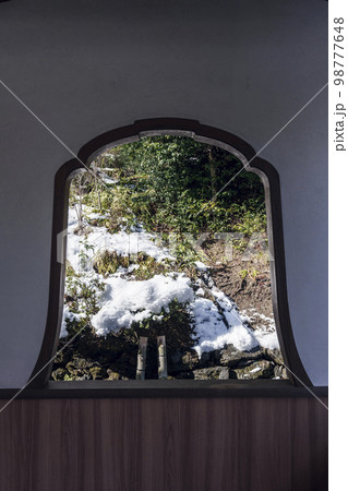京都嵐山・二尊院 本堂廊下の火打窓から見る雪景色