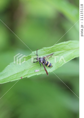 蜂に擬態する蛾、ヒメアトスカシバ。そばに、アワダチソウグンバイ
