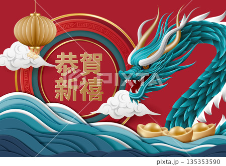 金元寶、龍與大海波浪,中國農曆新年龍年、元宵節或端午節剪紙摺紙工藝賀年廣告橫幅海報宣傳單素材圖片
