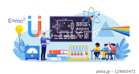 Physics school subject. Pupil studying electricity, magnetism, light wave and force in classroom. Teacher pointing at chalkboard, teaching kid. Child learn physical science. Theory, lab experiment
