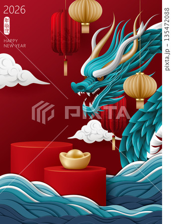 金元寶、龍與商品展示平台,中國農曆新年龍年、元宵節或端午節摺紙工藝賀年廣告直式海報宣傳單素材圖片