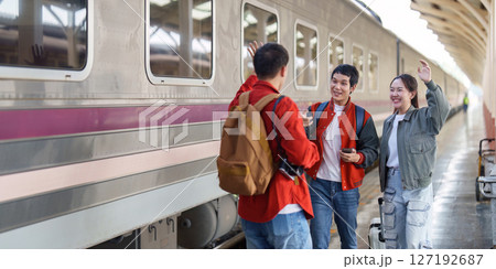Farewell Wave. Friends saying goodbye at the train station.