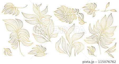 Vector set of gold wavy leaves isolated, plant branch line illustration, luxury foliage decoration. Vintage ornament elements, jungle, summer background.