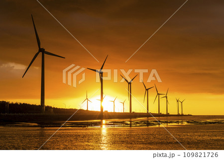 Sunset view of the Gaomei wetlands landscape and the wind power systems in Taichung, Taiwan. energy systems and renewable energy.