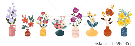 Flower bouquets in wrapping and blooming plant in clay or plastic flowerpots, wicker basket set. Tulip, rose and bud composition. Decorative florist shop items. Flat vector illustration