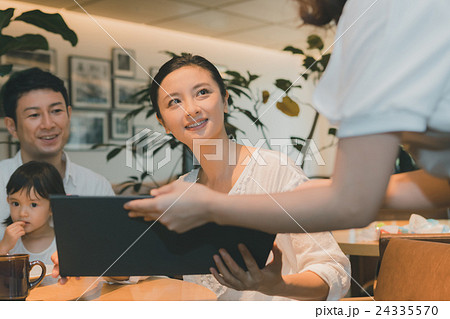 カフェでメニュー表を見ながら注文・オーダーする若いアジア人女性