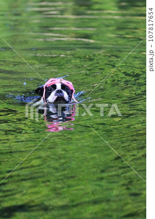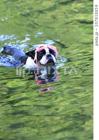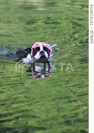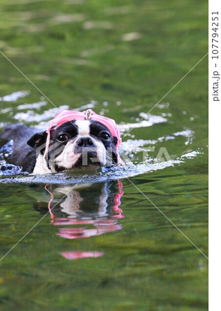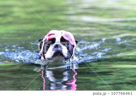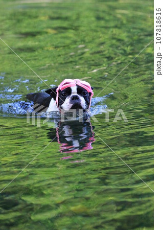 川遊びの人気スポット都幾川をゴーグルを付けて泳ぐボストンテリアのマイティ君♡